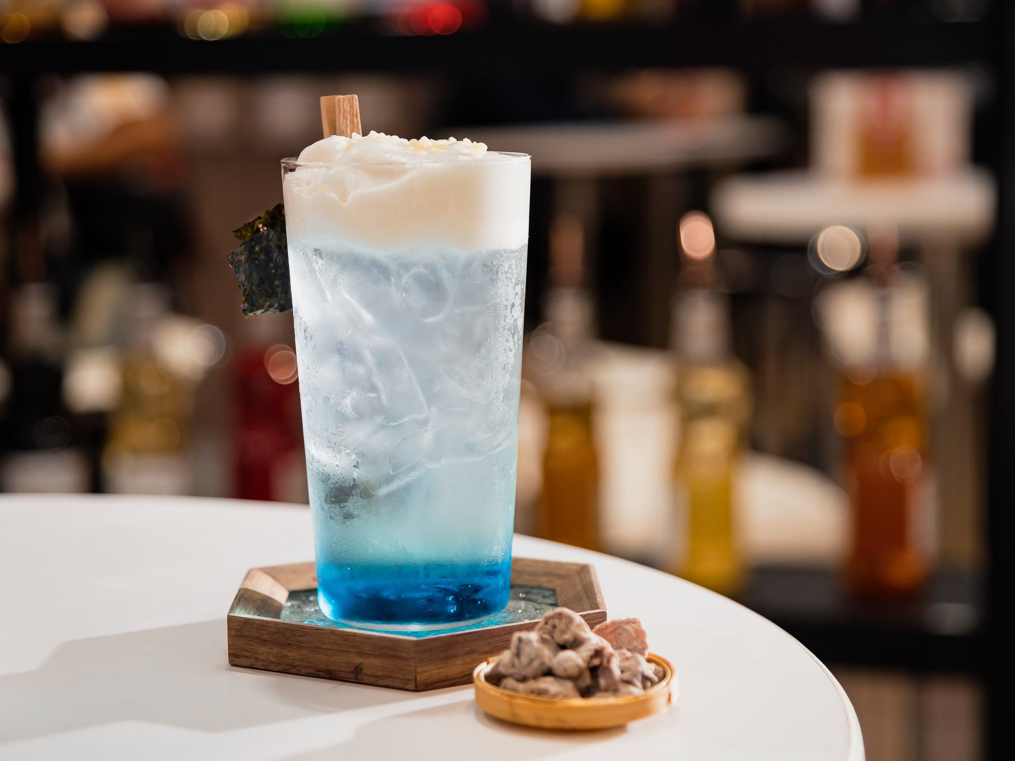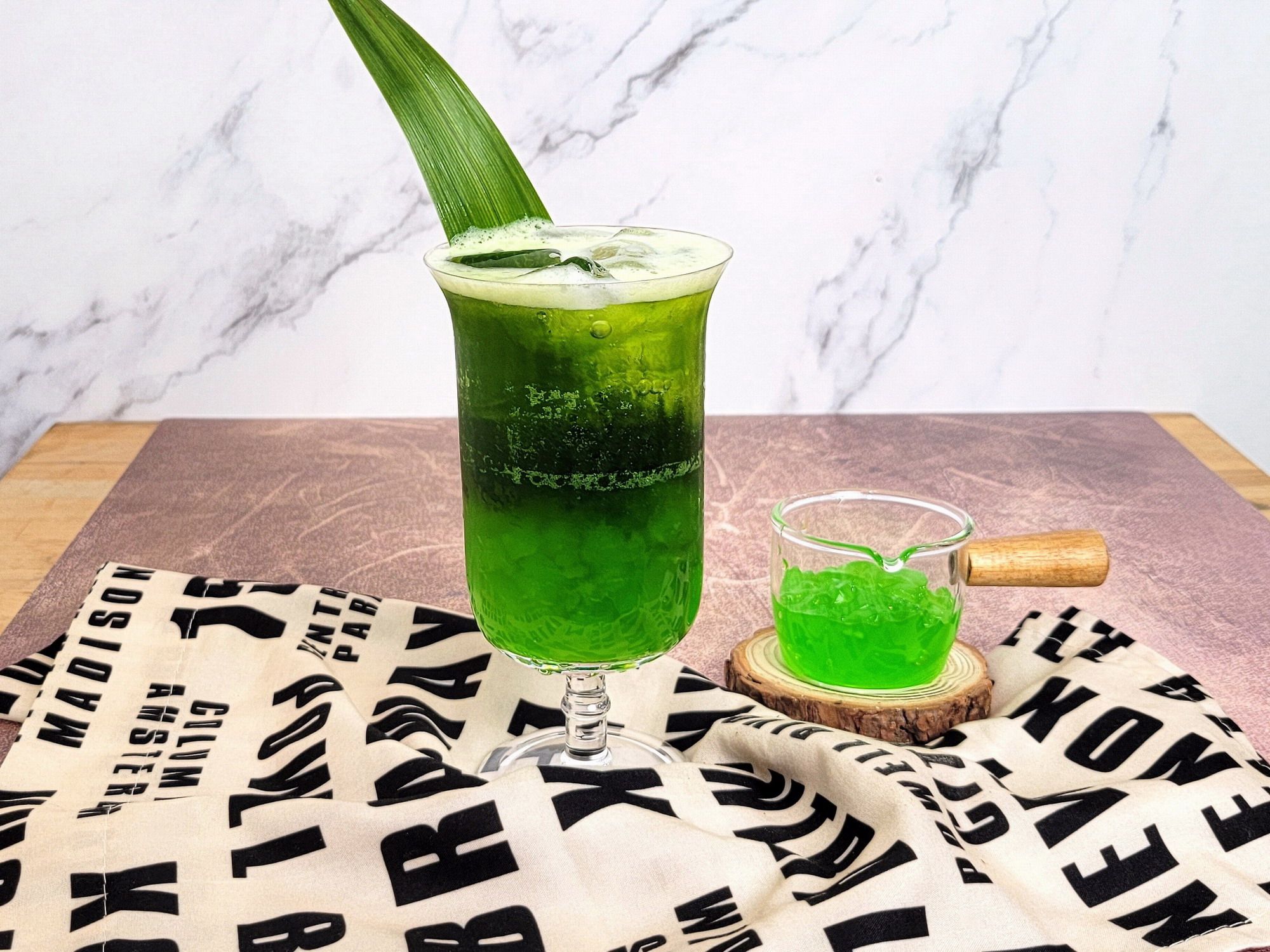 再加入班蘭葉的清香及翠玉色,最後利用蘋果西打的氣泡,將整體香氣帶至鼻腔,完整了整杯的風味!