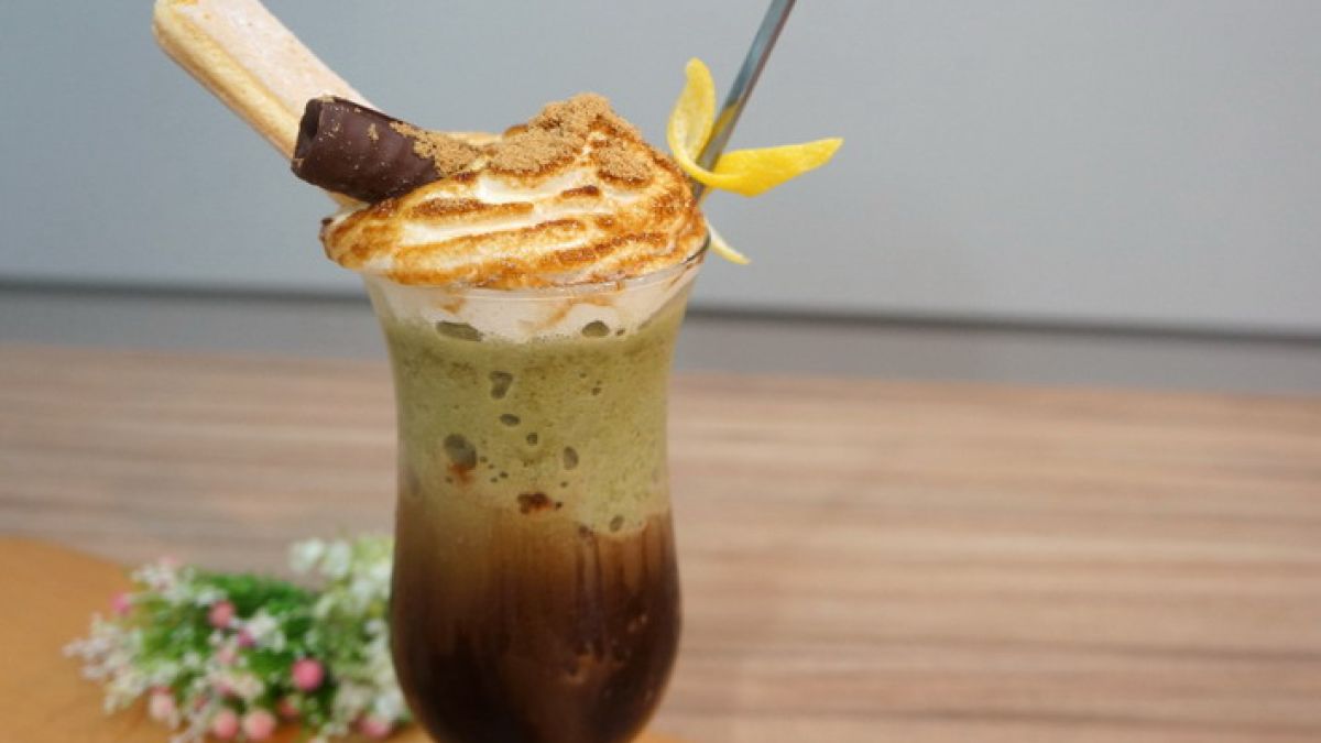 沁涼的抹茶冰沙,以榛果巧克力糖醬做為調味,