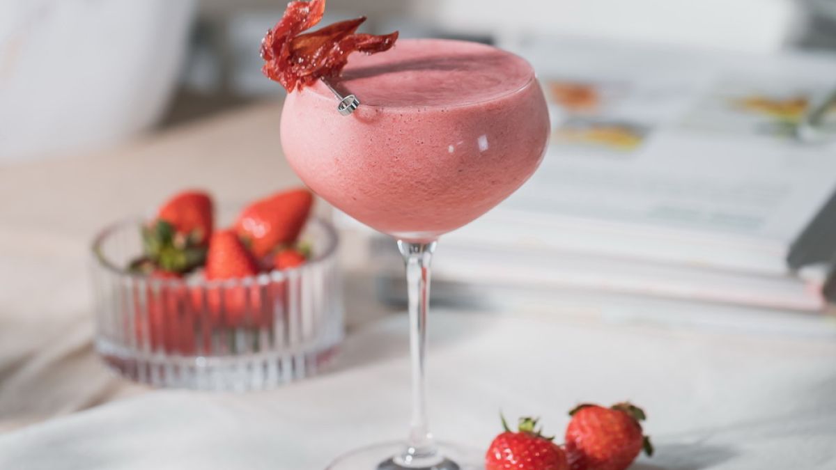 1. 冰沙機加入草莓果粒凍、蔓越莓汁、洛神花茶、草莓、義大利蛋白霜粉、檸檬汁、莓果風味糖漿,不加冰塊,攪打均勻