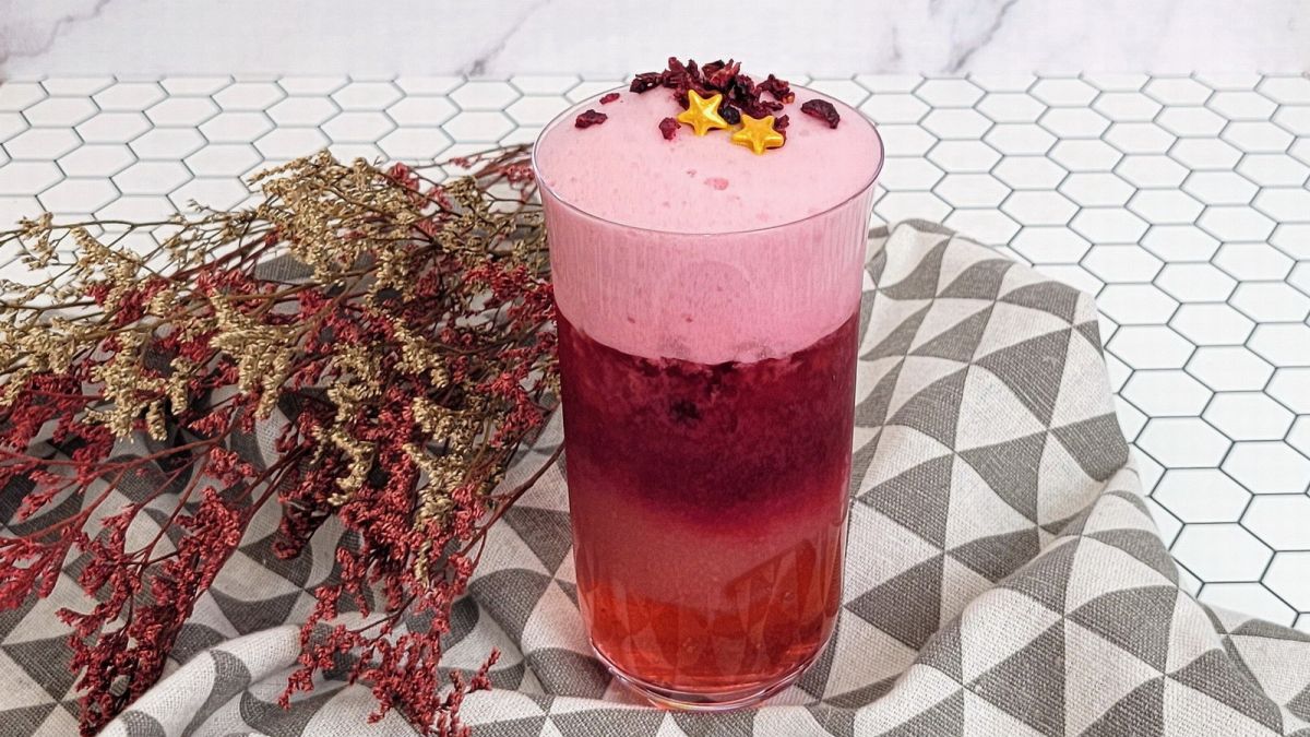 3. 草莓果茶與義大利蛋白霜BK加入搖酒器中加冰搖勻