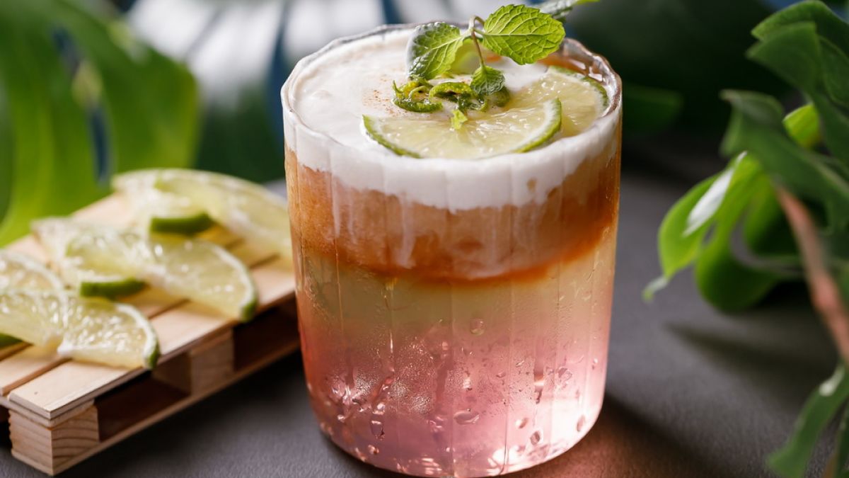3. 將氣泡水、蘋果汁、接骨木風味糖漿混合後慢慢倒入分層