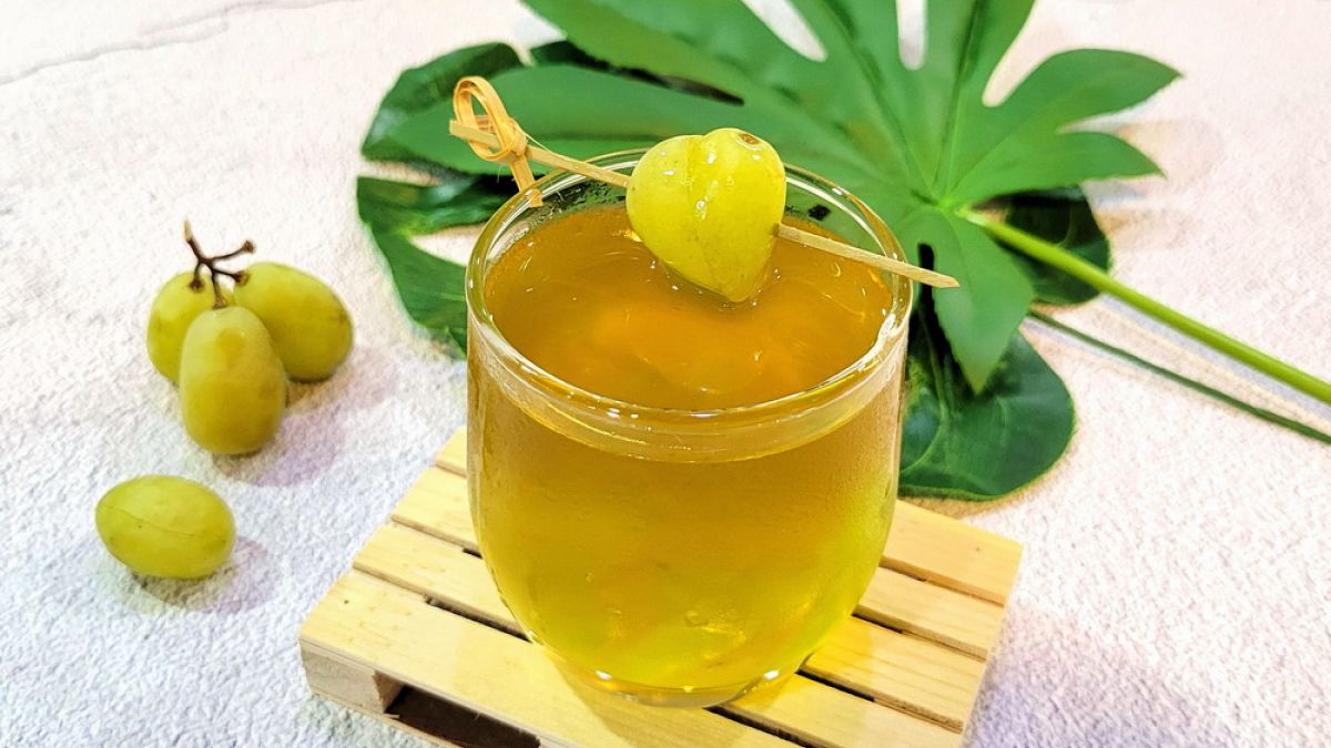 1. 依序於杯中放入青葡萄果凍、冰塊、及混拌均勻之茶湯和果糖