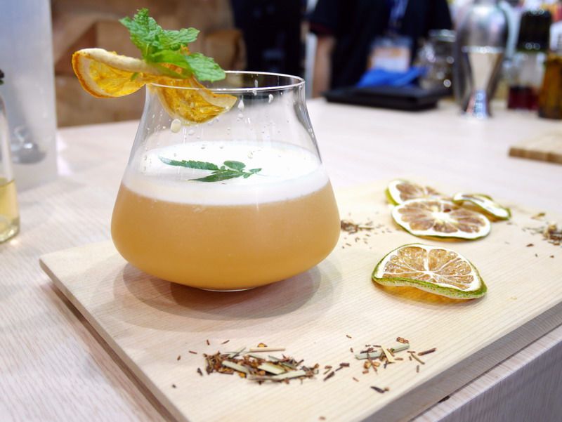 1. 將黑醋栗茶包(6g/包)以100ml熱水浸泡5分鐘。將茶包取出後加冰塊至200ml待備用。