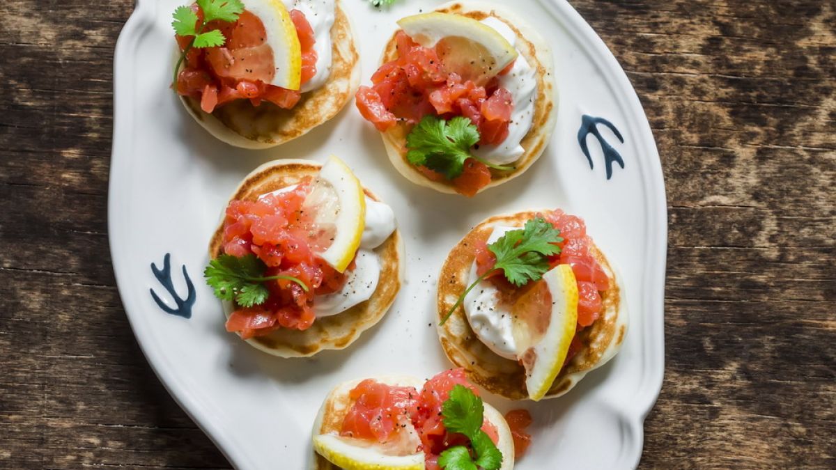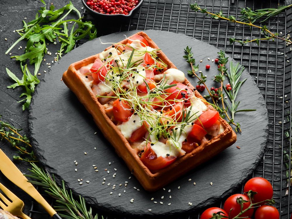 法國麵包切片,放上橄欖油漬鮮紅蕃茄、紅黃甜椒、洋菇及洋蔥,